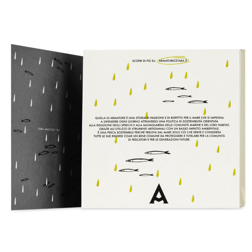 The anchovies undergo a long maturation under sea salt, lasting several months, before being preserved in olive oil.